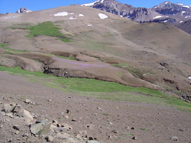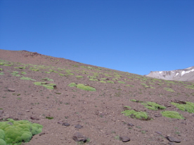 Vista general de la vegetación del alta-montaña en los Andes de Chile central a los 3200 m de altitud (A). Comunidades dominadas por plantas en cojín (Azorella monantha) a los 3600 m de altitud en los Andes de Chile central (B).
